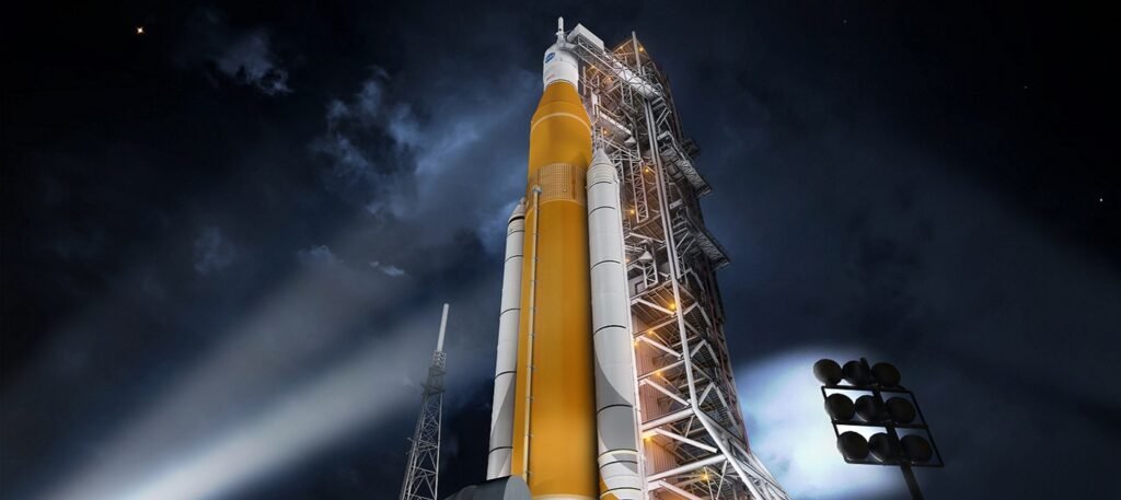 SLS roketini içeren yakın zamanda yer tabanlı bir testin tamamlanmasının ardından teknisyenler ÅŸimdi Florida’daki Kennedy Uzay Merkezi’nden fırlatılmaya hazırlanmak için araçta son ayarlamalar yapıyorlar.