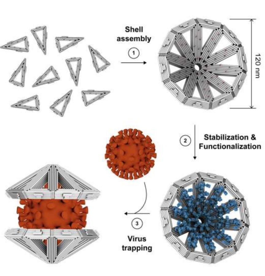 DNA origami, tamamı nano ölçekte iki veya üç boyutlu şekiller oluşturmak için manipüle edilen DNA ipliklerini içerir. Bu yeni çalışmada, çok küçük viral partikülleri yakalamayı hedeflendi. Ekip, daha büyük virüsler için daha büyük tuzaklar oluşturmak üzere yararlı şekillerde birbirine yapışacak şekilde tasarlanmış hem uzun hem de kısa DNA şeritlerini kullandı. Daha sonra bunları birbirine yakın yerleştirildiklerinde yapboz parçaları gibi birbirine yapışan üçgen 2B yapı taşları oluşturmak için kullandılar ve virüs işlevi görebileceğine inandıkları yapılar oluşturmaya başladılar. Hedefledikleri yapıların istenilen şekle sahip olduğunu doğruladıktan sonra bunların içini virüsleri bağladığı bilinen kimyasallar veya antikorlarla kapladılar. Son olarak tuzakları canlı virüslerin yakınına yerleştirerek test ettiler. Tuzakların umulduğu gibi çalıştığını ve çapı 100 nanometre kadar büyük olan virüsleri yakaladığını buldular. Kapana kısıldıklarında virüsler, diğer hücrelerle bağ kuramadı ve böylece enfeksiyonlar önlendi.