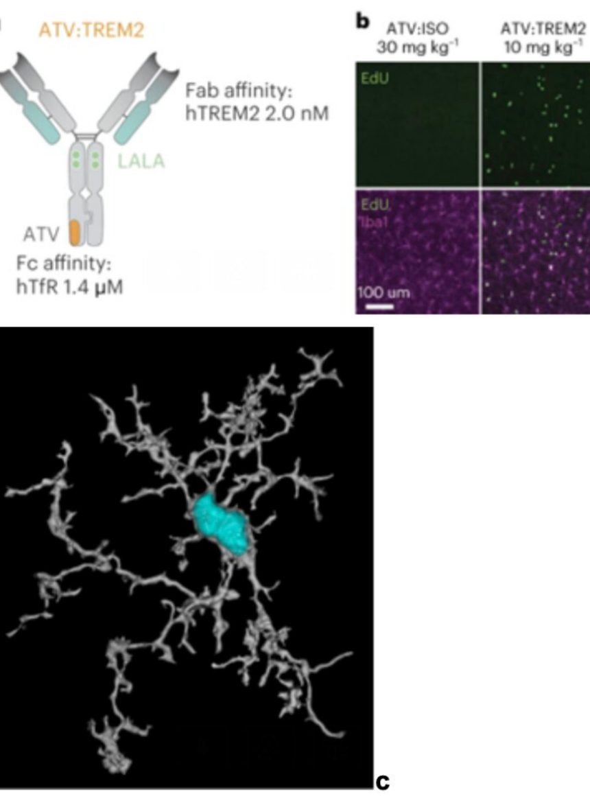 Araştırmacılar ATV:TREM2’yi insan kaynaklı pluripotent kök hücre (iPSC) kaynaklı mikroglia üzerinde test ettiler. Bu önemli bağışıklık hücrelerinin çoğalmasını teşvik ettiklerini ve metabolizmalarını iyileştirdiklerini keşfettiler. Ayrıca antikorlarını farelerde test ettiler ve bunun hayvanların beynindeki mikroglial aktiviteyi ve glikoz metabolizmasını önemli ölçüde artırdığını buldular.
