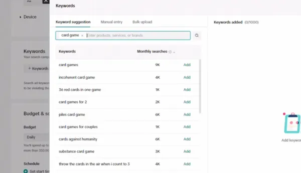 Bu örnekte görebileceğiniz gibi, TikTok’un sistemi girdiğiniz terimlere göre hedeflenecek anahtar kelimeler de önerecektir.