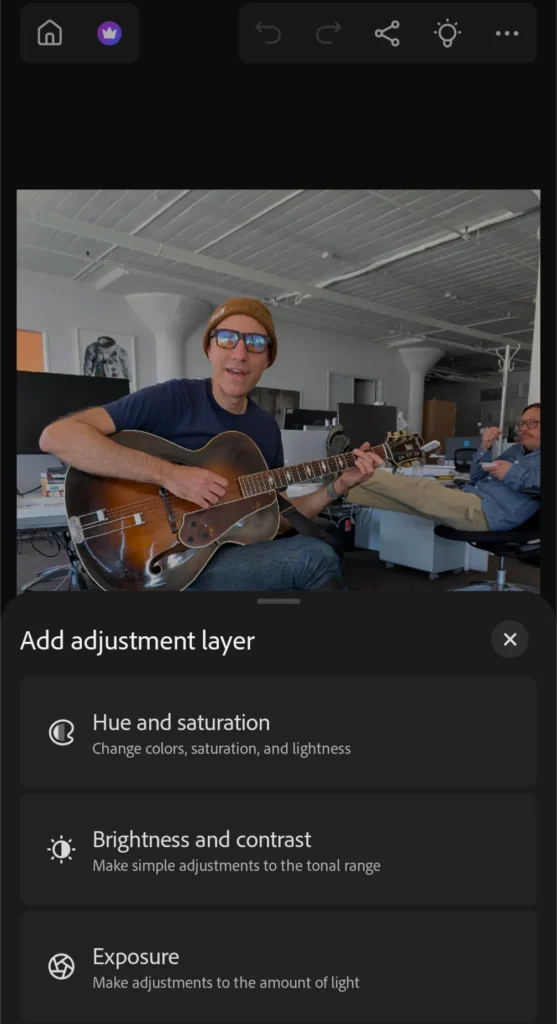 Mobil Photoshop’ta bulunan katman türleri masaüstü sürümdekiyle benzerlik taşır. Örneğin, tüm katmanı renkler ve gradyanlarla dolduran “Doldurma Katmanı” (Fill layer) veya altındaki katmanların renk ve tonlarını ayarlayan “Ayar Katmanı” (Adjustment layer) gibi. Her katmanın kendine özel ayarları var ve bu ayarlar katman türüne göre değişiklik gösterir. Bu ayarlara araç çubuğundaki “Katman Özellikleri” (Layer properties) menüsünden istediğiniz zaman ulaşabilirsiniz.