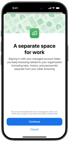 Kullanıcılar, yönetilen bir hesaba ilk kez giriş yaptıklarında veya bu hesaba geçiş yaptıklarında, yönetilen hesap taramasının ayrımını ve kuruluşlarının verilerini nasıl işlediğini açıklayan bir başlangıç ekranı görecekler.