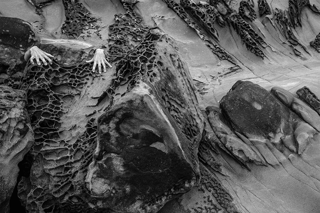 İran asıllı fotoğrafçı Azita Gandjei, siyah beyaz karelerinde insan bedeniyle doğa arasındaki çizgiyi neredeyse görünmez hale getiriyor. Gandjei’nin “Spot the Human” (İnsanı Bul!) başlıklı serisi, izleyiciyi bir oyuna davet ediyor: Gördüğünüz şey bir ağaç kabuğu mu yoksa bir omuz mu? Bir kaya parçası mı yoksa bir sırt eğrisi mi?