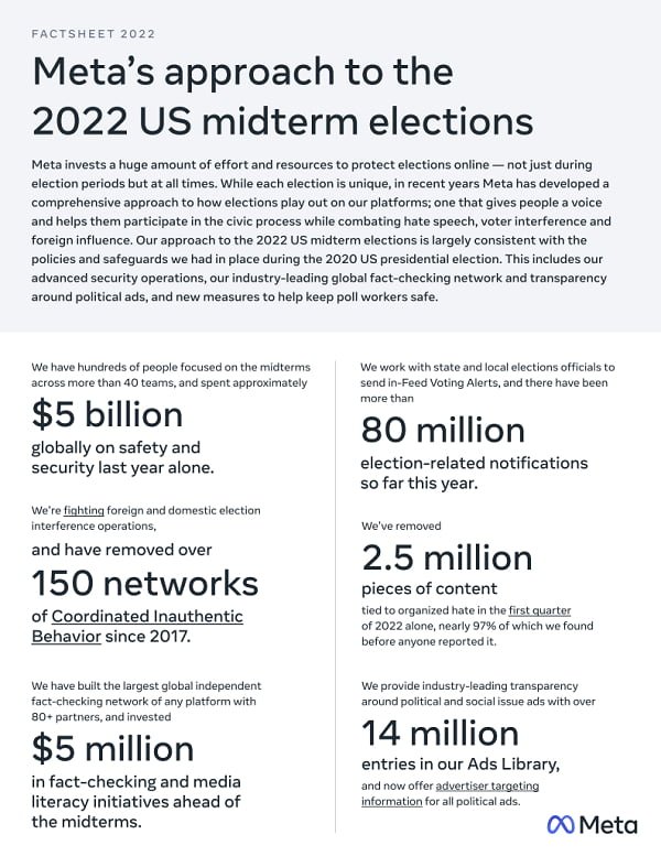 Meta, yaklaşan 2022 ABD ara dönem seçimleri için geçmiş deneyimlerinden öğrendiklerini birleştirerek aşağıdaki uygulamaları yapacak: