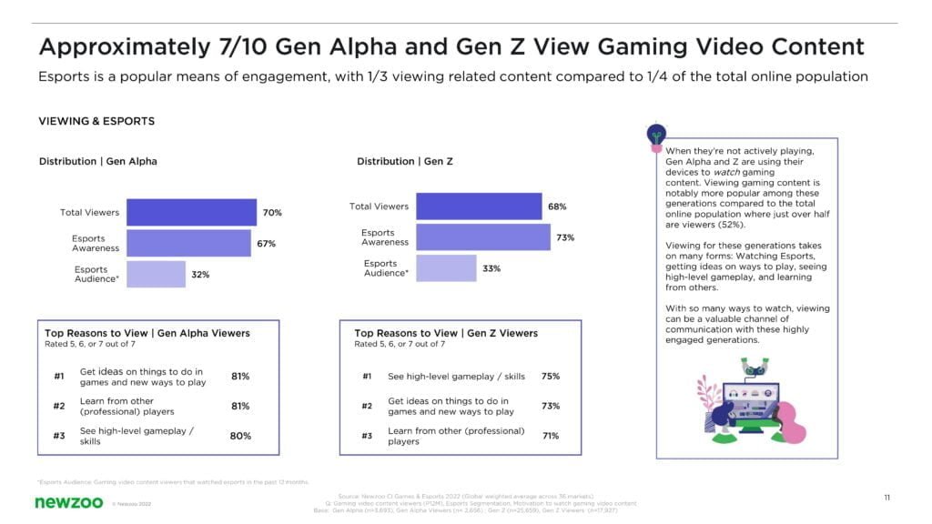 Newzoo, “Gen Z and Gen Alpha: The Future of Gaming” isimli raporunda “oyun hayranlarını” oynayarak veya izleyerek oyunlarla etkileşim kuranlar olduğunu belirtiyor. Yani, Twitch’te veya YouTube’da oyun izlemek de “oyun” zamanına giriyor.