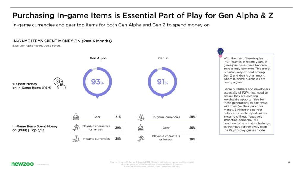 Ek olarak rapor, oyunlarda satın alım alışkanlıklarını da içeriyor. Her iki kuşağın da oyunlara para harcamasının daha olası olduğu gösteriyor. Harcamalar en çok mobil üzerinden yapılıyor ve ana sebepleri bir içerik açmak veya oyun içi karakteri veya silahı kişiselleştirmek.