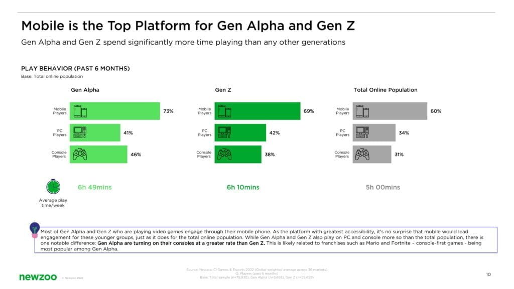 İki kuşak da diğer medya türlerinden daha çok oyun içerikleriyle ilgileniyor ve Z Kuşağının %88’i, Alfa Kuşağının %92’si oyun oynadığını bildiriyor. Son 6 ay içerisinde iki kuşak da platform olarak mobili tercih ediyor (%69 ve %73) ve Alfa Kuşağı için konsol PC’ye göre daha popüler. İki kuşak için de haftalık oynama süresi 6 saati aşıyor.