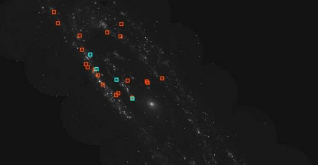F148W filtresinde Andromeda Galaksisi görüntüsü üzerine bindirilmiş, dağınık UV emisyonu (kırmızı kareler) tespit edilmiş 20 SNR’nin ve olası, ancak karışık, dağınık emisyonlu (mavi kareler) 5 SNR’nin konumları.