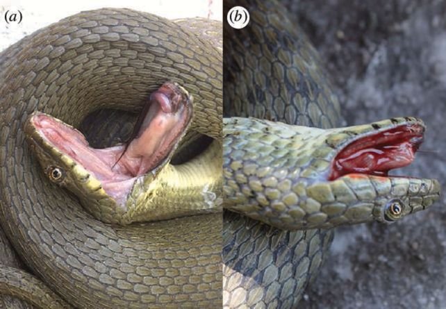 Araştırmacılar 263 yılanı gözlemledi ve yılanları orta kısmından yakalayarak tepkilerini kaydetmeyi başardı. 124 yılan dışkılama yaparken 28 yılan ağızlarını kanatarak tepki gösterdi. Ve sadece ölüm numarası yapan yılanlarda otohemoraji görüldü.