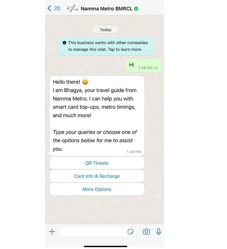 WhatsApp ve Bangalore Metro Rail Corporation (BMRC), şehrin Namma Metro adlı hızlı toplu taşıma sistemi için WhatsApp chatbot tabanlı QR biletleme hizmeti başlatmak üzere ortaklık kurduklarını söyledi. İngilizce ve Kannada dillerinde mevcut olan chatbot, yolcuların tek seferlik toplu taşıma biletlerini satın almalarına, metro seyahat biletlerini yeniden yüklemelerine, güncel ücret tablolarını kontrol etmelerine ve toplu taşıma tarifelerini görüntülemelerine olanak tanır. Tren yolcularının, sohbet robotuyla etkileşimlerini başlatmak için +918105556677 numaralı telefona ‘Merhaba’ mesajını göndermesi gerekir.