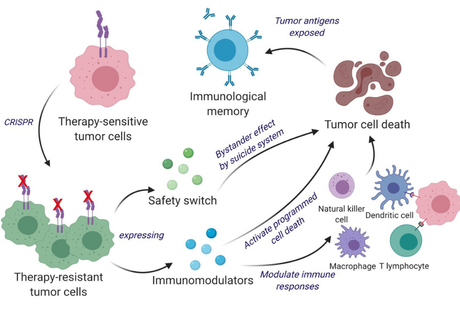 Bilim insanları, canlı tümör hücrelerini terapötik hale dönüştürerek iki işlevli bir terapötik strateji geliştirdiler. Shah’ın ekibi, gen düzenleme aracı CRISPR-Cas9’u kullanarak canlı tümör hücrelerini tasarladı ve tümör hücrelerini öldüren ajanı serbest bırakmak için onları yeniden tasarladı.