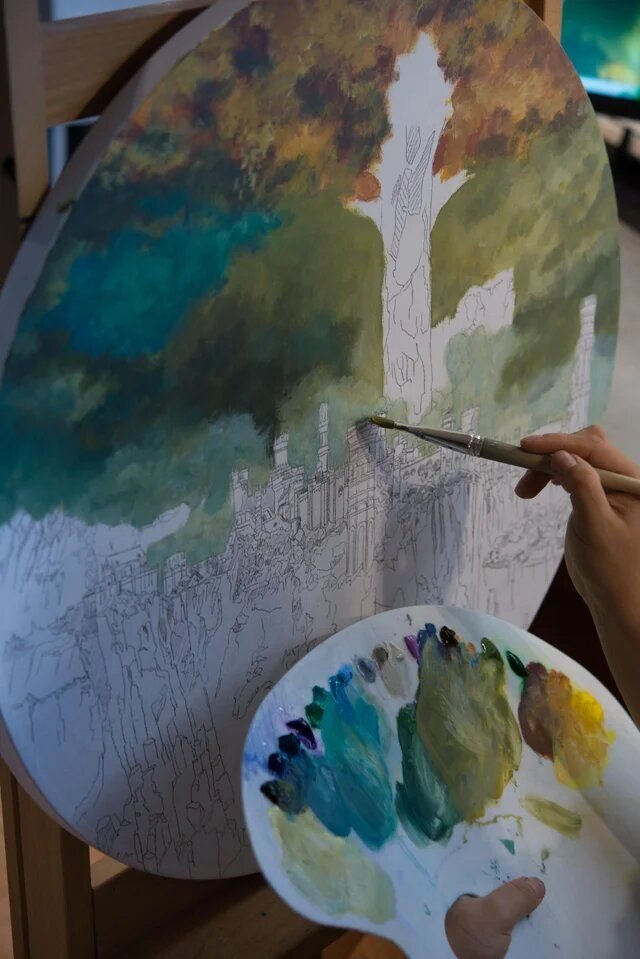 MapleFoxArt olarak tanıdığımız Diana Elaken, fotoğraflarda çarpıcı sanatının boyama sürecini de gösterdi. Önce çevreyi ve arka planı tamamlayan Diana, daha sonra Stormveil Castle’ın büyük ve karmaşık tasarımını sanatına ekledi. Bu görüntülere bakılırsa, oyun içi kaleyi en iyi şekilde yansıtabilmek için tasarım ve renk seçiminde oldukça titiz davranmış gibi görünüyor.