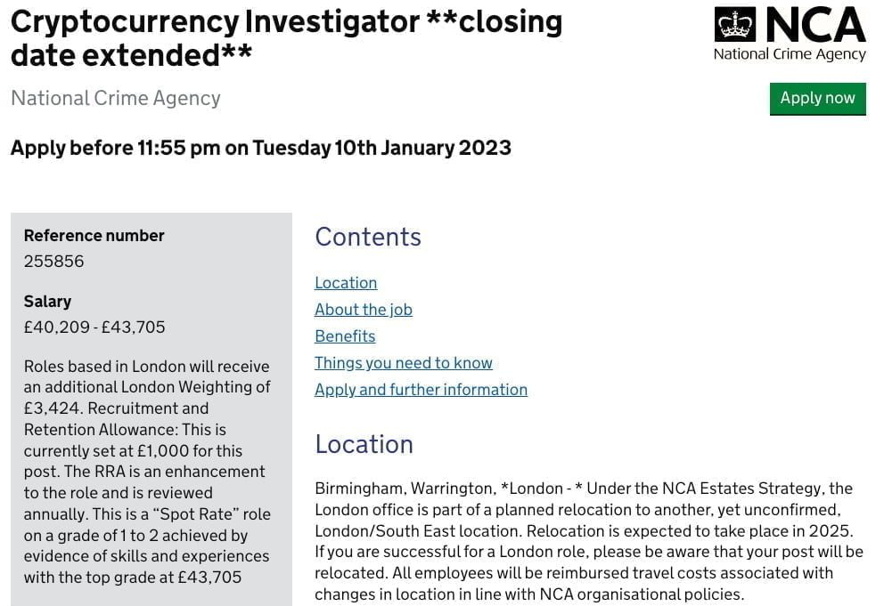 Birleşik Krallık bu konuyu artık daha ciddiye alan yönetimlerden biri olduğunu güvenlik teşkilatında kripto suçlarına özel bir birim açmak için müfettiş-uzman arayışına girişerek ortaya koydu. Yıllık 40.209 ila 43.705 sterlin (yaklaşık Yıllık 1 milyon₺-Aylık 82.250₺) arasında bir ücret karşılığına müfettiş arayan güvenlik teşkilatı, bu birimi alanında yetkinliği yüksek kişilerden oluşturmak istiyor.