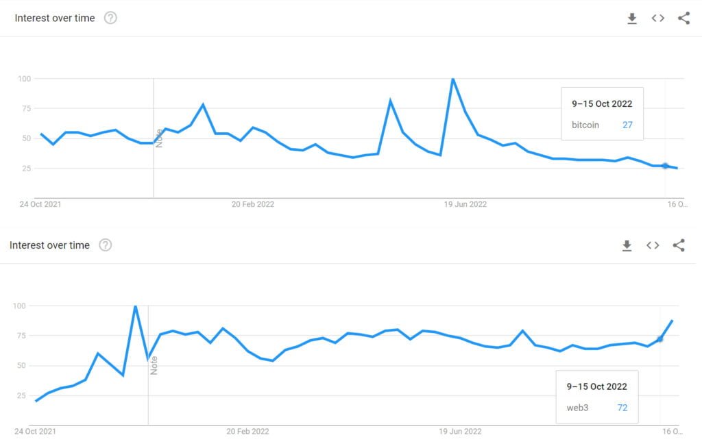 Uzun süredir piyasanın yükünü sırtlanmasına rağmen küresel Google aramalarında Bitcoin, bir yıldan uzunca bir süredir görmediği dip noktaya ulaştı. Öte yandan Web3 için yapılan Google aramaları hız kazanarak artmaya devam etti ve 2022’de popülerlik açısından tüm zamanların en yüksek seviyesine ulaştı.