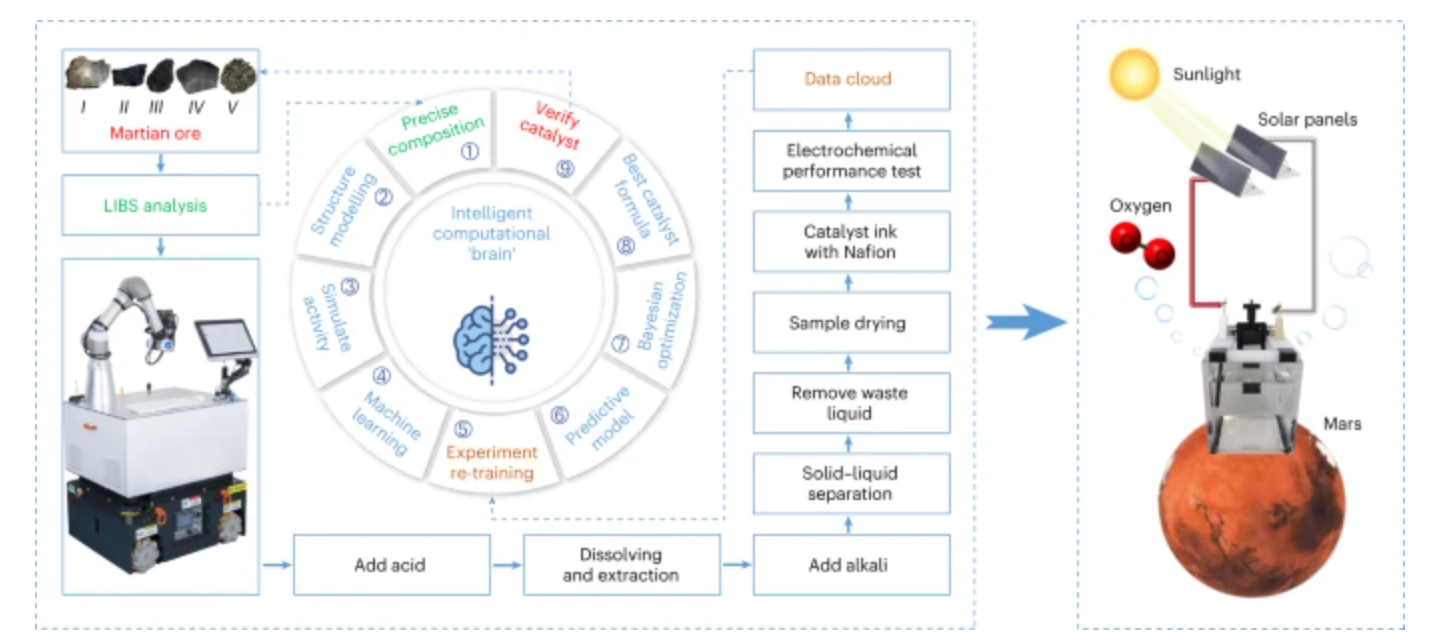 Bu amaçla ekip, beş adet Mars vb. göktaşı örneğinden oksijeni çıkarma sürecinin tamamını otomatikleştiren bir mobil robot inşa etti. Ayrıca araştırma ekibi bu yeni sistemi Mars yüzeyi simülasyon ortamında da test etti. Yapay zekâ, oksijen üretebilmek için neredeyse 4 milyon olası kombinasyon arasından mükemmel olan formülü aradı. Araştırmacılar “Çalışmamız, gelişmiş bir yapay zekâ kimyagerinin insan müdahalesi olmadan Mars’ta yerel cevherlerden “OER katalizörleri” sentezleyebileceğini gösteriyor.” diye yazdı.