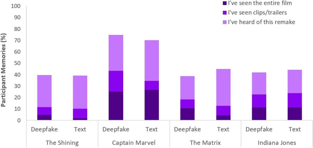 Daha önceki araştırmalarda gözlemlendiği gibi hem deepfake videolar hem de yazılı açıklamalar, katılımcıların sahte remake yapımlarına dair yanlış anılar geliştirmesine neden oldu ve katılımcıların ortalama yüzde 49’unun her biri, izlediği uydurma filmin orijinal bir film olarak var olduğuna inanıyor.
