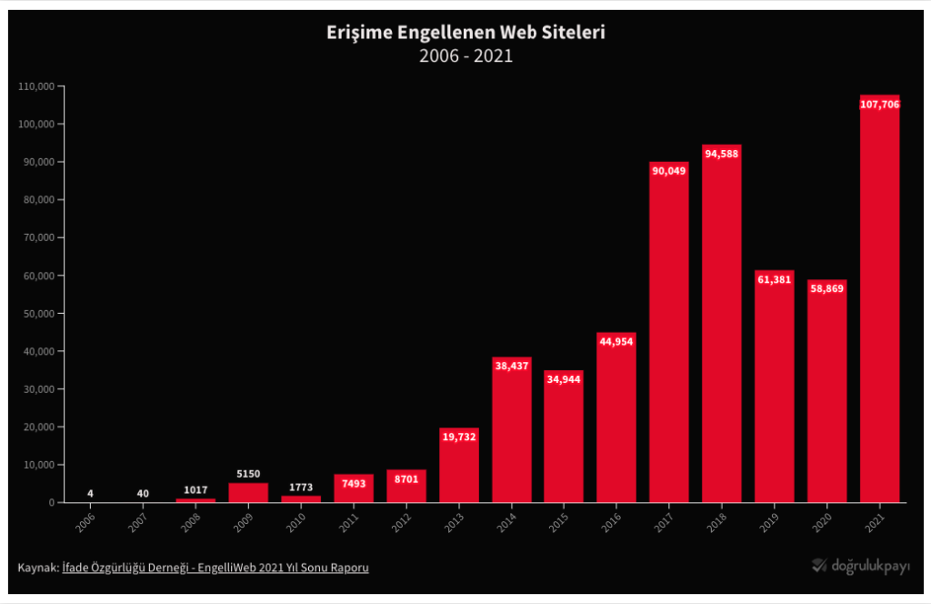 2006 yılı boyunca sadece 4 web sitesi kapatılırken 2021’de bu rakam, 107 bin 706’ya çıktı. 2016’da 45 bin civarı olan kapatma sayısı, o yıl yaşanan darbe girişiminin ardından ise 2017’de çıkarılan KHK yasaların da desteği ile iki katına çıkmıştı.