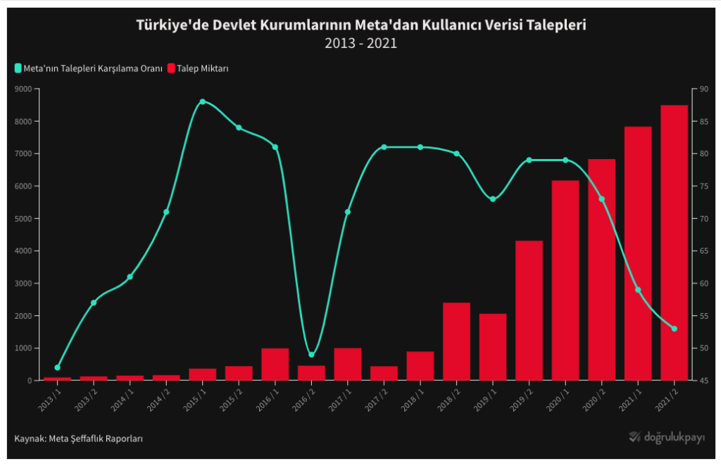 Özellikle 2013’ten sonra devletin Meta, Twitter, Instagram, YotuTube, TikTok ve Facebook gibi ağlardan kullanıcı verisi isteme ve içerik kaldırma taleplerinin de gözle görülür bir artışı var. Buna göre örneğin 2013’te Meta’dan istenen kullanıcı verisi sayısı 96 ve Meta’nın bu isteği karşılama sayısı 47 iken 2021’de istenen kullanıcı verisi 8.490’a çıkmış ve bu isteğin karşılanma sayısı da 53’te kalmış.