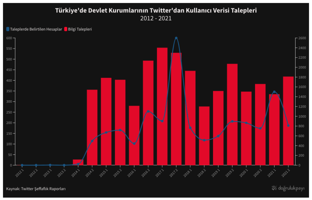 Benzer bir durum Twitter için de söz konusu. Twitter şeffaflık raporuna göre hükûmet, 2014 yılında 51 bilgi ve hesap verisi talep etmiş. Sonraki yıllarda bu talepler binleri aşmış. 2021 yılında toplam sayı 1.800’e ulaşmış. Rekor seviyede istekte bulunulan yıl ise Gezi Olayları’nın ardından gelen 2015 olmuş. Bu yıl hükûmetin içerik kaldırma talebi sayısı 2.071 ile dünya çapında bir rekor olmuş. Twitter raporunda maalesef bu taleplerin ne kadarının karşılandığı yönünde bir veri yok.