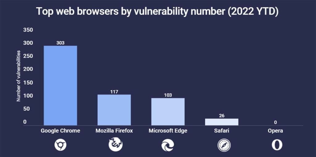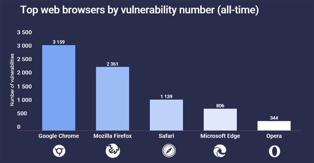 Atlas VPN, 2022’de raporlanan güvenlik açıklarından oluşan veri tabanıyla bir liste yaparak en güvenliden en güvensiz tarayıcıya kadar bir sıralama yaptı. Sonuçlara göre Chrome, en fazla güvenlik zafiyeti bulunan tarayıcı.