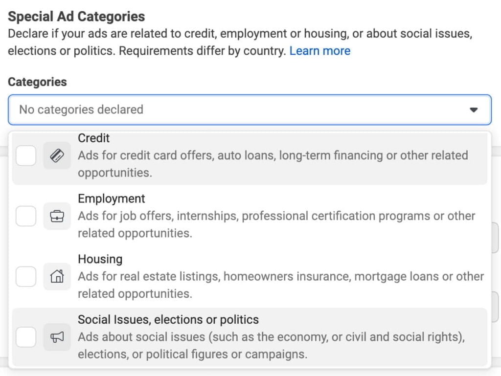 Kuruluşunuzun sosyal ve politik konularda reklam yayımlama yetkisi yoksa, metniniz yerel seçimlerden iklim değişikliğine kadar uzanan sosyal ve politik konulardan bahsedemez. Bu konularda reklam yayımlamak için önce bir yetkilendirme işlemini tamamlamanız gerekir. Yetkilendirme sürecini tamamladığınızda, kampanyanızın Meta’nın özel reklam kategorilerinden biri olan Sosyal Konular, Seçimler veya Politika ile ilgili olduğunu belirtmeniz gerekir. Kampanyanızı yayımladığınızda, reklamlar otomatik olarak bir sorumluluk reddi ile yayımlanır.