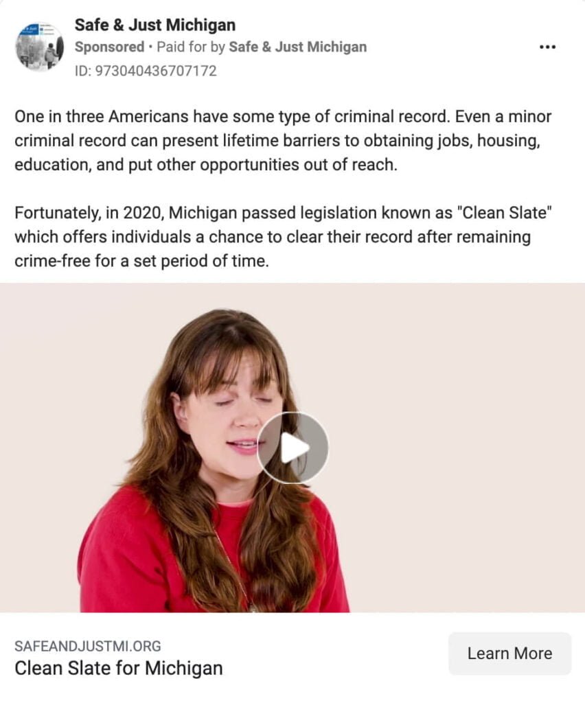 Sabıka kaydı olan kişilere yönelik hizmetler sunuyor olsanız bile, durumlarını bilmemek çok önemlidir. Asla “Sizin gibi birçok hükümlü suçluya yardım ettik” gibi bir şey söylemeyin. “Hizmetlerimiz, önceki tüm ihlalleri aşmak için tasarlanmıştır” diyebilirsiniz. Aşağıdaki Facebook reklamında sabıka kaydı mevzuatı ile ilgili bilgiler paylaşılmakta. Reklam metni, sabıka kaydı olan kişilerin önündeki fırsatlarda nasıl etkilendiğini tartışıyor ve doğrudan hedef kitleye konuşmak yerine “bireylere kayıtlarını temizleme şansı sunduğunu” açıklıyor.