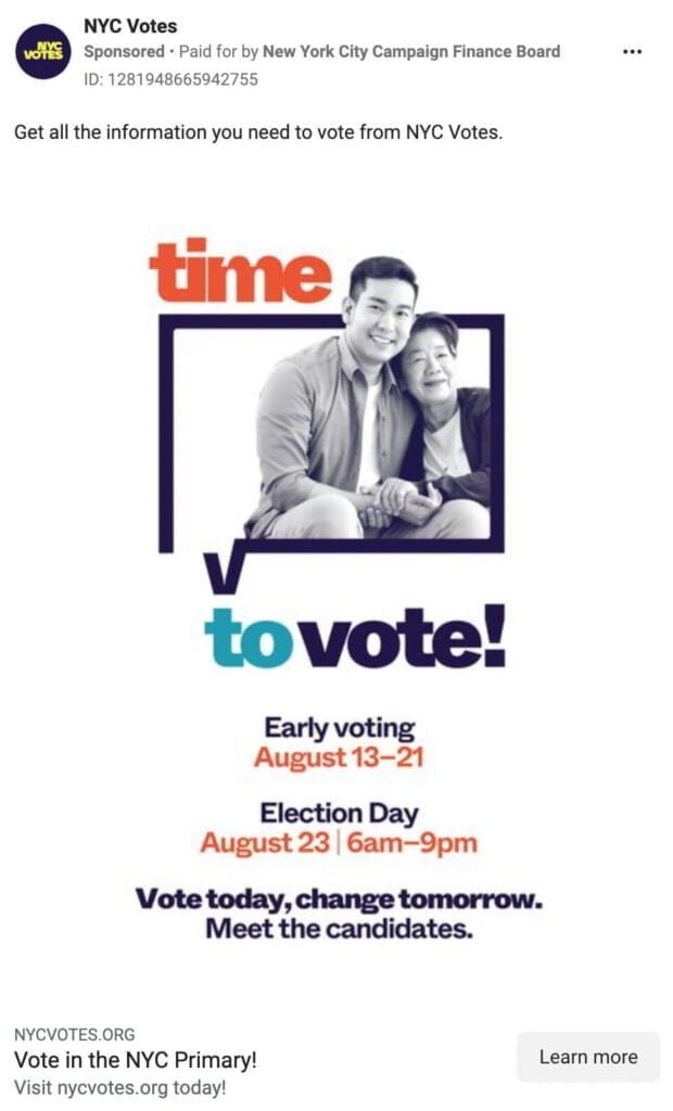 Aşağıdaki reklam, New York City sakinlerini ön seçimlerinde oy kullanmaya teşvik ediyor. Reklam, seçmeni “ihtiyacınız olan tüm bilgileri almaya” teşvik ediyor ve bireysel davranışları veya kişisel özellikleri vurgulamaktan kaçınıyor.