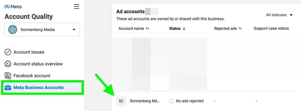 Hesap Kalitesi kontrol panelinizde Reklam Hesapları bölümünü bulun. Bu sekme, reklam hesabı durumunu görüntüler ve reddedilen tüm reklamları vurgular. Daha fazla ayrıntı görmek veya bir sorunu çözmek için herhangi bir reklam hesabını seçin.