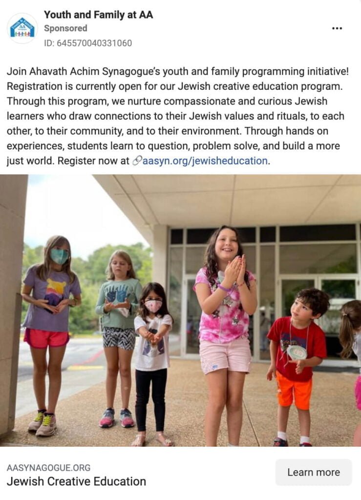 Aşağıdaki reklam, Yahudi öğrenciler için bir gençlik ve aile programlama girişimini tanıtmaktadır. Reklam metni, aday öğrencilerin veya velilerin bireysel özelliklerini vurgulamak yerine, programın sunduğu hizmetlere odaklanır.