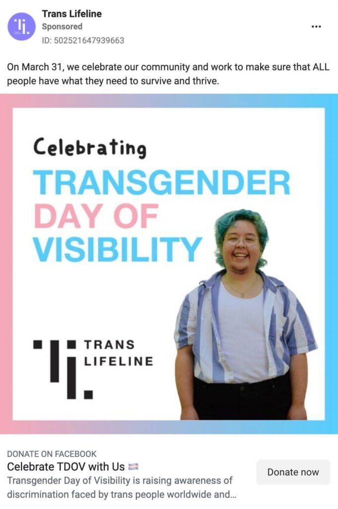 Aşağıdaki reklam, Transseksüel Görünürlük Günü boyunca farkındalığı artırmayı amaçlıyor. Reklam, doğrudan izleyicinin cinsiyet kimliğine hitap etmek yerine, “topluluğumuzu kutlayın” ve “TÜM insanlar” gibi kapsayıcı bir dil kullanıyor.