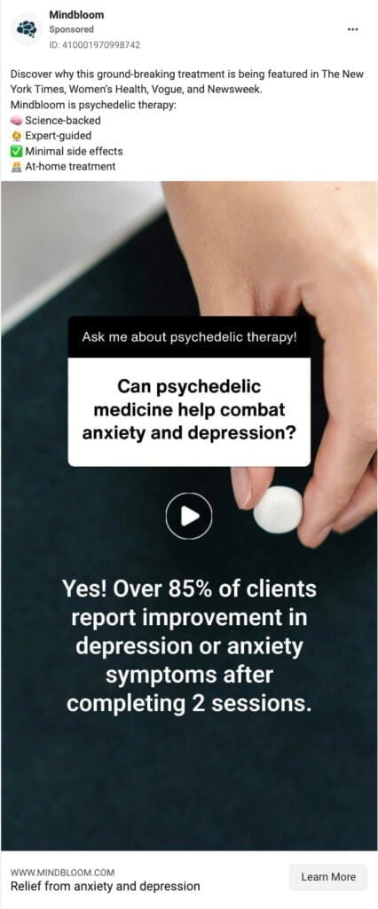 Örnekteki reklam, depresyon ve anksiyete için bir tedaviyi vurgulamakta. Bununla birlikte reklam metni, hedef kitlenin zihinsel sağlığıyla konuşmak yerine, tedaviyi tanımlamaya ve geçmiş müşterilerin neler başardığını paylaşmaya odaklanıyor.