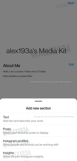 Uygulama araştırmacısı Alessandro Paluzzi tarafından yayımlanan bu ekran görüntüsünde de gördüğünüz gibi, Instagram şu anda içerik oluşturucularına markalara yönelik rehberlik edecek yeni bir “medya kiti” seçeneği geliştiriyor.