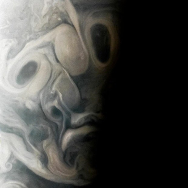 Akıllara durgunluk veren büyüklüğü bir yana, tüm dünyamızı kolayca yutabilecek fırtınaları olan bu gezegen, bulut oluşumlarından dolayı sinir bozucu bulut şekilleri alabiliyor. NASA’nın uzay sondası olan Juno tarafından, eylül ayı başında yakalanan bir fotoğrafta endişe ve korku dolu bir ifade yer alıyor.