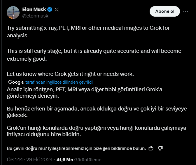 Tıbbi verilerin yapay zekaya yüklenmesi konusu, Elon Musk’ın tweetiyle birlikte ön plana çıkmıştı. Geçtiğimiz ay Musk, bir tweetinde “Grok’a analiz için röntgen, PET, MRI veya diğer tıbbi görüntüleri göndermeyi deneyin. Bu hala erken aşamada, ancak zaten oldukça doğru ve son derece iyi hale gelecek.” dedi.