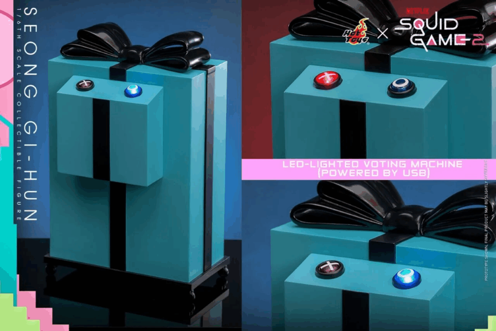 Hot Toys’un Seong Gi-hun figürü, dizinin sembolik unsurlarını içeren çeşitli aksesuarlarla birlikte sunuluyor. Bunlardan biri, USB ile çalışan oy verme makinesi. Dizide oyuncuların yarışmaya devam edip etmeme kararını verdiği bu cihaz, figür setinin önemli parçalarından biri olarak yer alıyor.