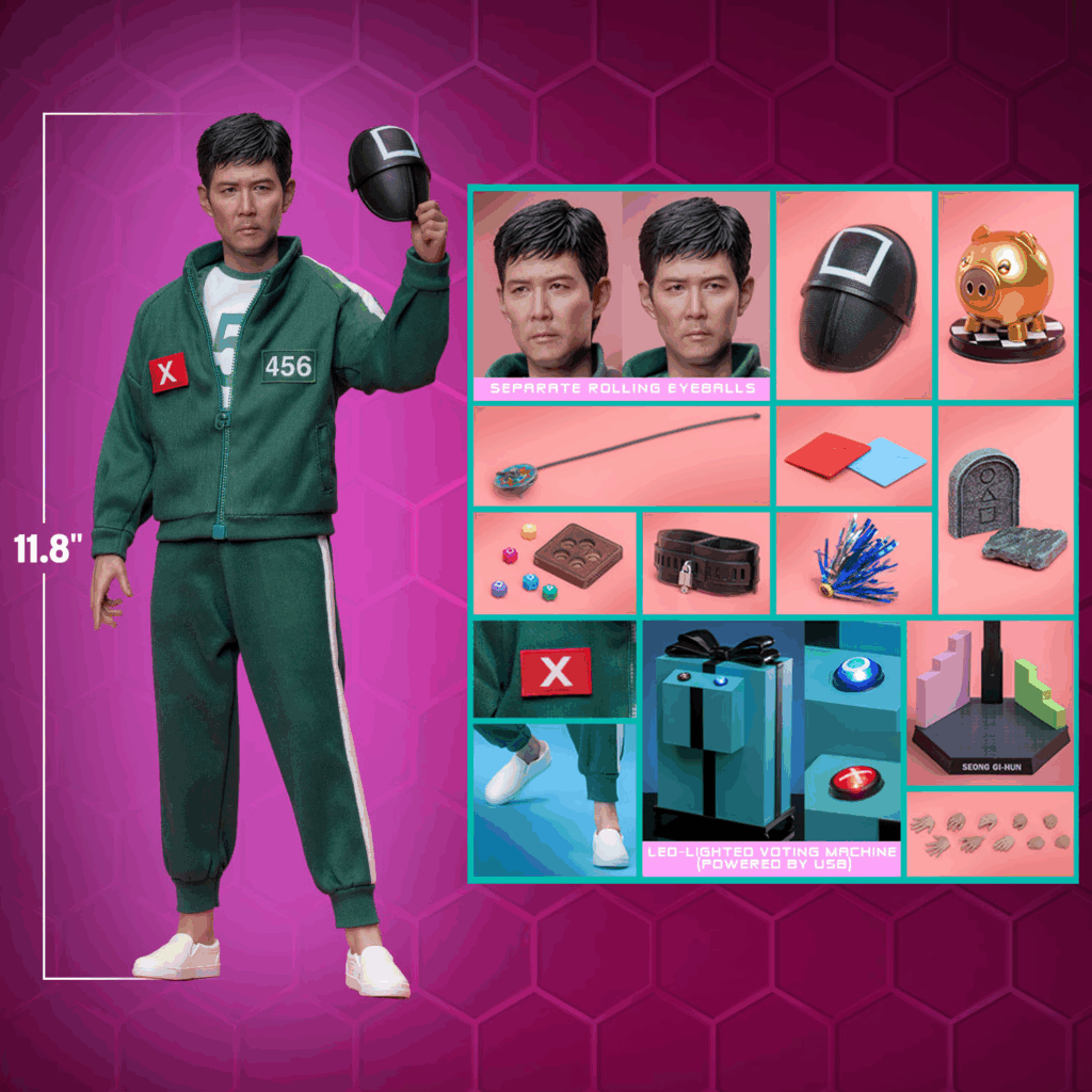 Hot Toys tarafından üretilen Seong Gi-hun koleksiyon figürü, altıncı ölçekli (sixth-scale) olarak tanımlanan standartta hazırlandı. Bu ölçek, figürün gerçek insan boyutunun yaklaşık altıda biri oranında küçültülmesi anlamına geliyor. Buna göre figür, yaklaşık 30 santimetrelik bir yüksekliğe sahip.