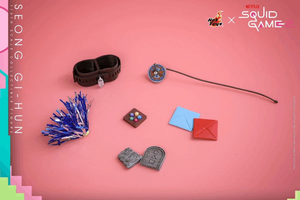 Bu oyun seti, Squid Game’in ilk iki sezonunda yer alan geleneksel oyunlara gönderme yapan parçaları bir araya getiriyor. Aksesuarların tamamı, figürle birlikte sergilenebilecek şekilde tasarlanmış.