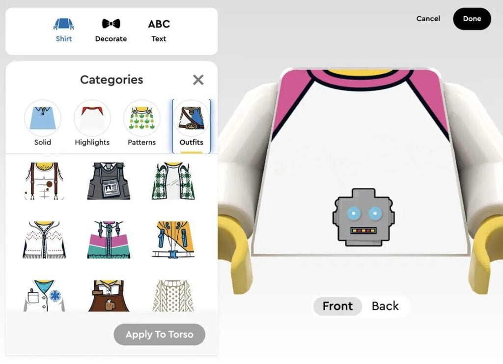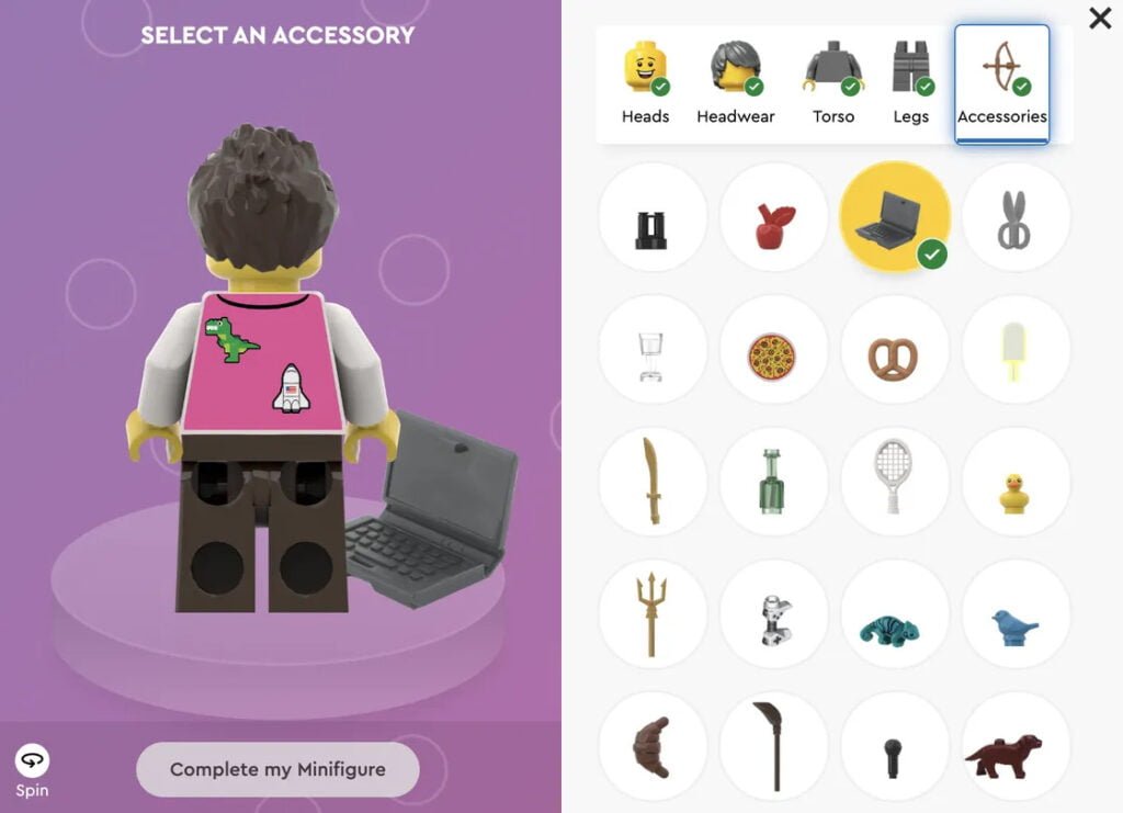 Araçta, özel minifigürünüz için farklı başlıklar, gövdeler, bacaklar ve aksesuarlar seçebileceksiniz. Gövde için çıkartmalar ve özel metinler uygulayarak kişiselleştirme konusunda ayrıntılara girebilirsiniz. (Kullanıcıların uygunsuz minifigürler yapmasını önlemek için tasarımları Lego yönetecek.) Ayrıca dizüstü bilgisayar, çubuk kraker ve pizza gibi aralarından seçim yapabileceğiniz bazı eğlenceli aksesuarlar da var. Tamamlanmış minifigürler 11,99 $’a mal olacak ancak hane başına yalnızca bir tane satın alabileceksiniz.
