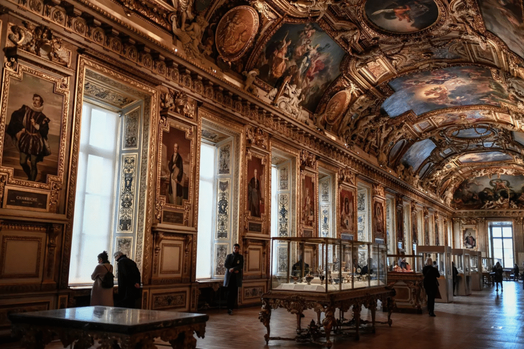İçeri adım attıkları yer, müzenin en ihtişamlı bölümlerinden biri olan Galerie d’Apollon (Apollo Galerisi) idi. Altın yaldızlarla süslenmiş tavanları, ışıkla parlayan vitrinleriyle bu salon, Fransa’nın kraliyet geçmişine ait mücevherlerin sergilendiği simgesel bir mekândı.