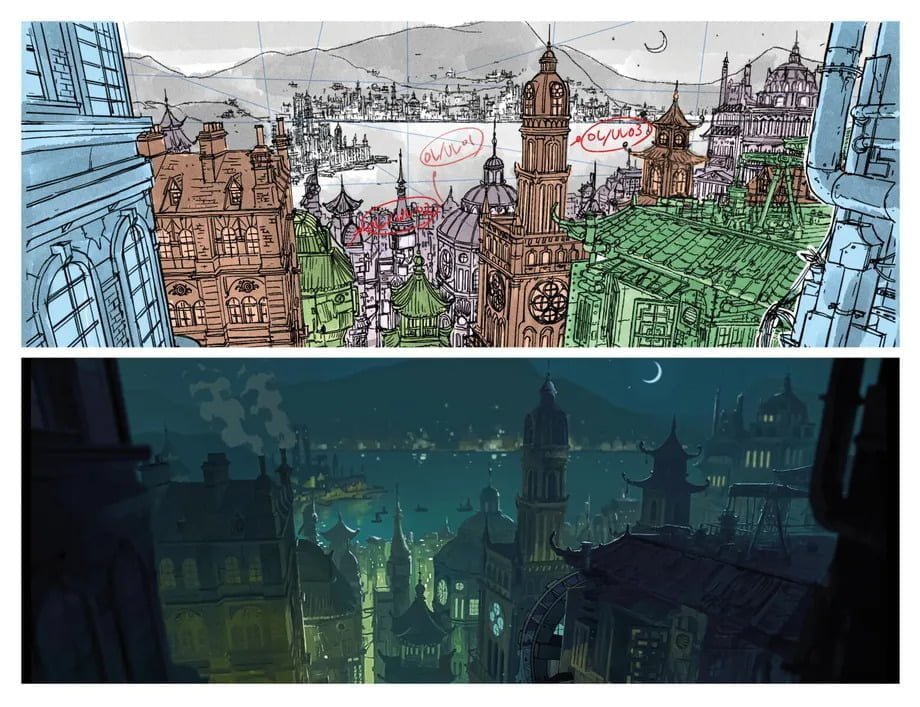 Böyle bir çeşitlilik oluşturmak doğal olarak çok fazla sanatsal keşif gerektiriyor ve bunların çoğunu The Art of Love Death + Robots’da dizinin üç sezonunu da kapsayan koleksiyonda keşfedebilirsiniz. Birinci sezonun “Ice Age” bölümündeki donmuş şehrin çeşitli varyasyonlarını, “Sucker of Souls” bölümü için çizilen canavar tasarımlarını veya “Fish Night” bölümündeki tüm güzel yaratıkları ve benim favori bölümlerinden “The Witness” için yapılan konsept çalışmalarını; biraz daha yakın geçmişe bakacak olursak da üçüncü sezonun “Jibaro” bölümündeki çarpıcı kostümler ve takılardan oluşan koleksiyonu inceleyebilirsiniz. Ayrıca kitap tüm bölümleri ve farklı sanat stillerini birbirine bağlayan akıllıca tasarlanmış bir grafikle çalışmanın iç yüzünü bizlere sunuyor.