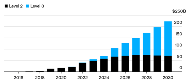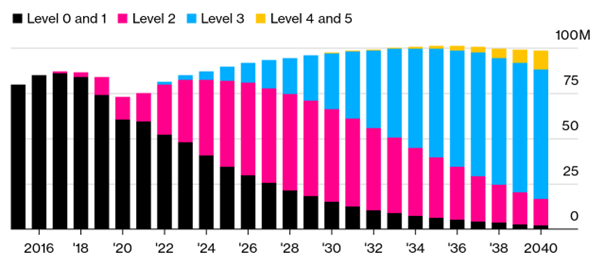 Seviye 3 araçların, Seviye 2 araç satışlarını azaltmasını ve yaklaşık 50 milyon araç satışı ile 2033 yılına kadar dünya çapında otomobiller için en yaygın özerklik seviyesi haline gelmesi bekleniyor. 2040’a gelindiğinde bile, Seviye 4 ve 5 robotaksiler, sürücüsüz sistemler için toplam pazarın oldukça küçük bir bölümünü oluşturuyor. Bununla birlikte, alt düzey otomasyon sistemlerinde ölçek ekonomilerinin oluşturulması, üst düzey otomasyon sistemlerindeki bileşenlerin maliyetlerini yavaş ama emin adımlarla aşağı çekecek ve bu iş modellerinin ekonomisini iyileştirecek.