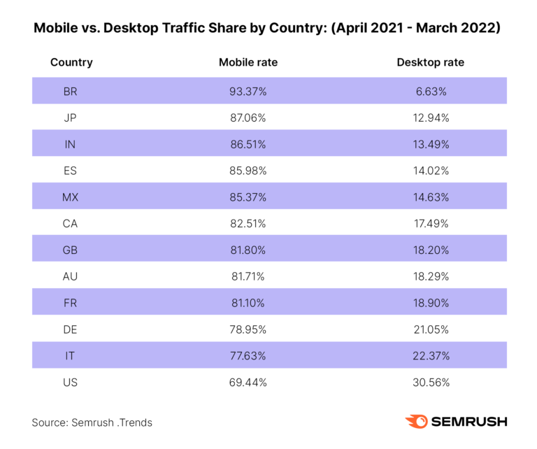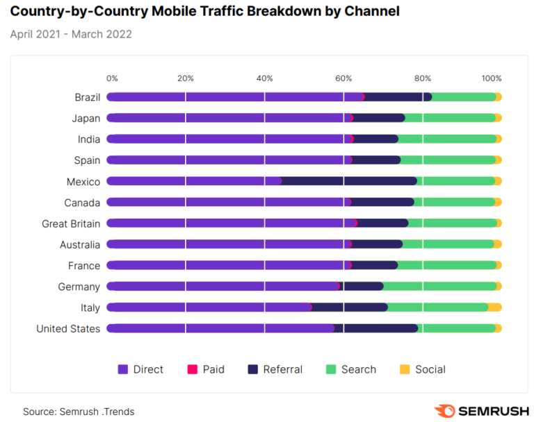 Semrush, mobil trafiğin tipik olarak doğrudan aramalardan kaynaklandığını ve trafik kaynaklarının küresel olarak büyük ölçüde benzer olduğunu ortaya koydu: