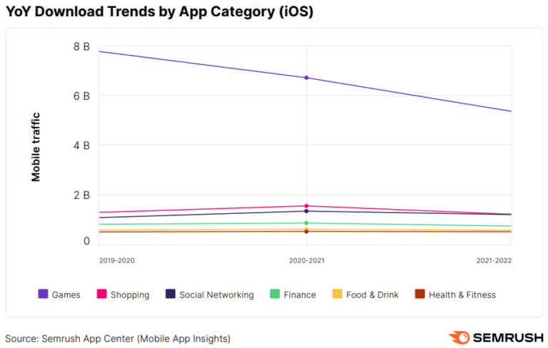 Mart 2022, Mayıs 2021’e göre %30 daha az mobil kullanıcı gördü. Bu, Covid ve evde kalma düzenlemelerine karşı ekonominin yeniden açılmasının, analistlerin ve uzmanların tahmin ettiği gibi, mobil kullanımın tam olarak geri dönüşüne yol açmayacağı anlamına geliyor. Buna, 2021 yılı boyunca iOS’ta büyük yükleme düşüşleri eşlik etti ek olarak 2021 Nisan ile 2022 Mart arasında alışveriş ve oyun uygulamalarına yönelik indirmeler %20 azaldı. Özellikle sağlık ve fitness türündeki en başarılı uygulamalar bile %5,4’lük bir düşüş gördü. Nisan 2020-Mart 2021 ve Nisan 2021-Mart 2022 istatistikleri karşılaştırıldığında en çok rağbet gören uygulama kategorilerinin hepsindeki yüklemelerde düşüş olduğu saptandı.