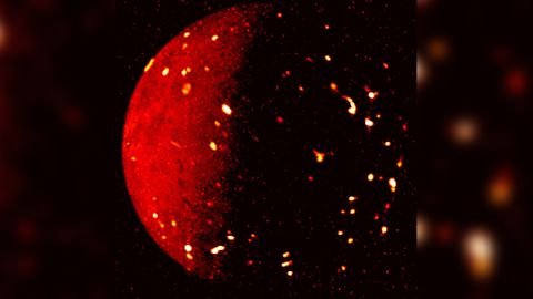 Juno, 5 Temmuz’da 80.000 kilometr) uzaklıktan Io’nun parlayan kızılötesi görüntüsünü yakaladı. Bu görüntüdeki en parlak noktalardan bazıları, Io’nun düzinelerce kilometre yüksekliğe sahip lav sıçramaları gönderebilen yüzlerce yanardağlarını gösteriyor.
