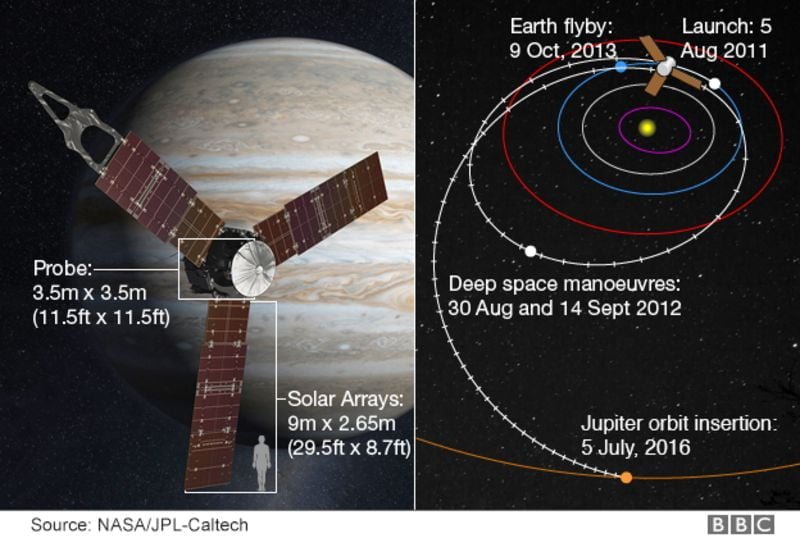 Juno, 5 Ağustos 2011’de Cape Canaveral Hava Kuvvetleri İstasyonu’ndan fırlatıldı. On yıllar içinde Jüpiter’in çevresinde sekiz uzay aracı daha uçmuş olsa da Juno’yu diğerlerinden ayıran şeylerden biri, Jüpiter’in çevresinden güneş enerjisi üretebilme yeteneğiydi. Diğer uzay araçları kaynağını nükleer güce dayandırıyordu fakat son yıllarda NASA’nın plütonyum üretimi için rezervleri azalmıştı.
