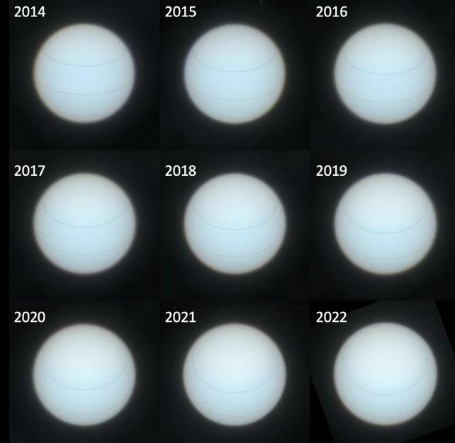 Bu yeni gözlemler sırasında bir başka gizem daha çözüldü. Bu gizem, Uranüs’ün neden 84 Dünya yılına eşdeğer olan bir sürede renk değiştirdiğiydi. Bunun cevabı ise, gündönümünde kutuplardan birinden Güneş’e baktığınızda Uranüs biraz daha yeşil bir renkte görünür. Ekvator’un Güneş’e dönük olduğu sırada ise Uranüs’e bakıldığında rengi biraz daha mavimsi tonlardadır.