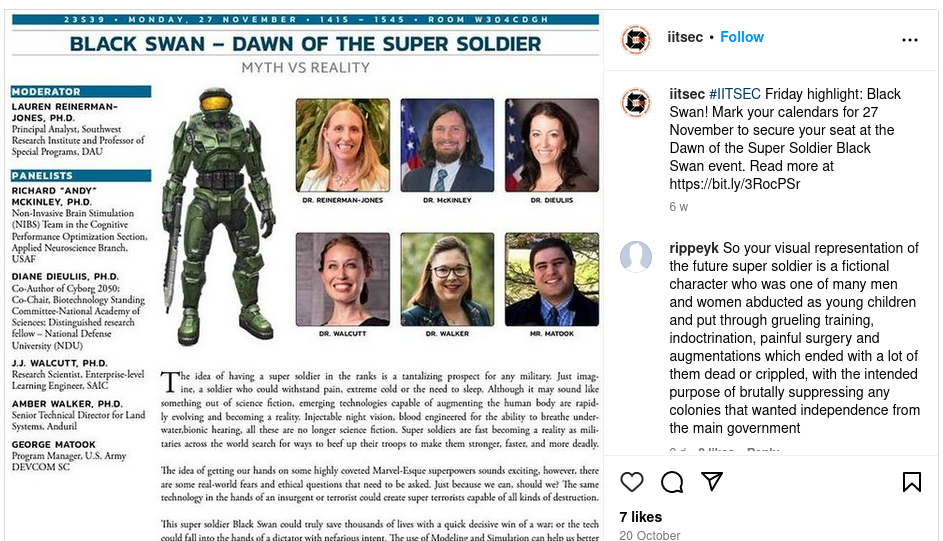 Amerikan ordusu ve savunma sanayisinin (İngilizcede Military Industrial Complex) beş ünlü üyesi, zirvenin gerçekleştiği Florida’da “Siyah Kuğu – Süper Askerin Doğuşu” panelinde süper askerleri tartışmak üzere bir araya geldi. Defense Acquisition University üyesi analist Lauren Reinerman-Jones’un moderatörlüğünde gerçekleşen panelde ABD Ordusu Geliştirme Komutanlığı (U.S. Army Developmental Command) temsilcileri George Matook ve Irwin Hudson, araştırmacı bilim adamı J.J. Walcutt ve Hava Kuvvetlerinde beyin stimülasyonu üzerine çalışan Richard McKinley yer aldı.