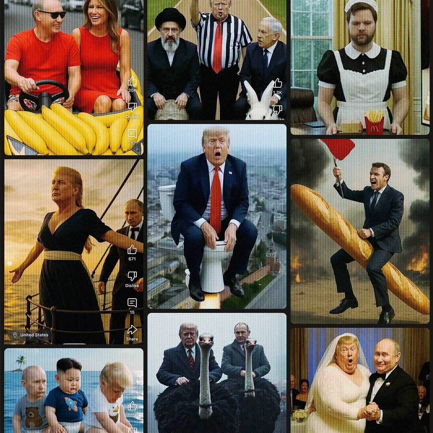 2025’te YouTube’da patlayan AI tabanlı slapstick videolar, dünya liderlerini absürt senaryolarda yerleştirerek Donald Trump’ı hedef alıyor. Putin, Khamenei ve Kim Jong Un’un Trump’ı şakalarla aşağıladığı bu videolar, 2,2 milyardan fazla izlenme aldı.