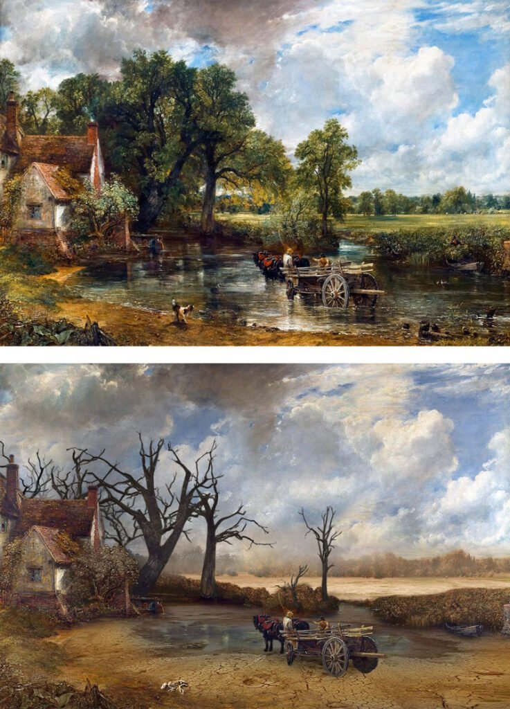 Devine, geçtiğimiz yaz Avrupa’yı zorlayan rekor sıcaklıklara, John Constable’ın The Way Hain tablosundaki bereketli nehri çorak bir nehre dönüştürerek dikkat çekiyor.