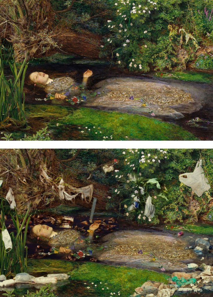 Sanatçı, Sir John Everett Millais’in Shakespeare’in karakterini betimleyen Ophelia tablosunda dereye plastik su şişeleri, yüz maskeleri ve poşetleri eklemeyi tercih ediyor.